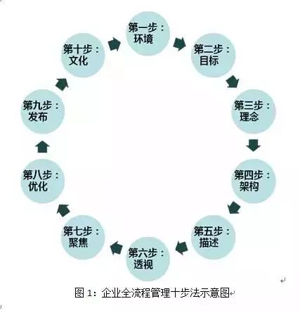 本文系統總結了企業進行全流程管理的十個完整步驟,如下圖所示,旨在幫助管理者找到一條實現流程管理的有效途徑,把握好其中的關鍵點,從而將流程管理對提升企業管理的價值最大化。